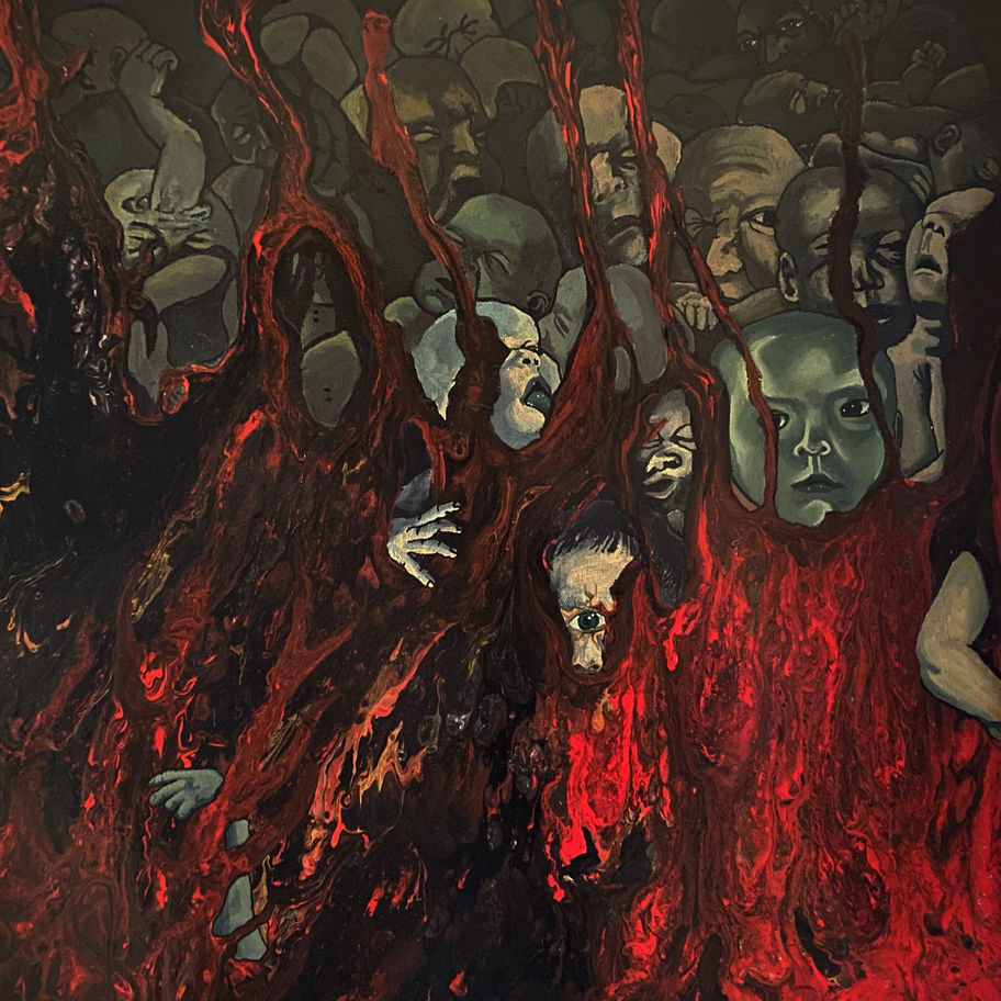 Created amidst cadavers and the cold gaze of medical observation, this disturbing piece emerged as a confrontation with legacy—genetic, spiritual, and monstrous. The twisted figures, born from the same crimson womb, coil like embryonic serpents, neither living nor fully dead. Their eyes—if you can call them that—seem to follow you, not with curiosity but with accusation. They are not merely anatomical studies, but warnings in flesh. Spawn of some invisible contagion, their forms mimic human gestation but veer violently into the grotesque.